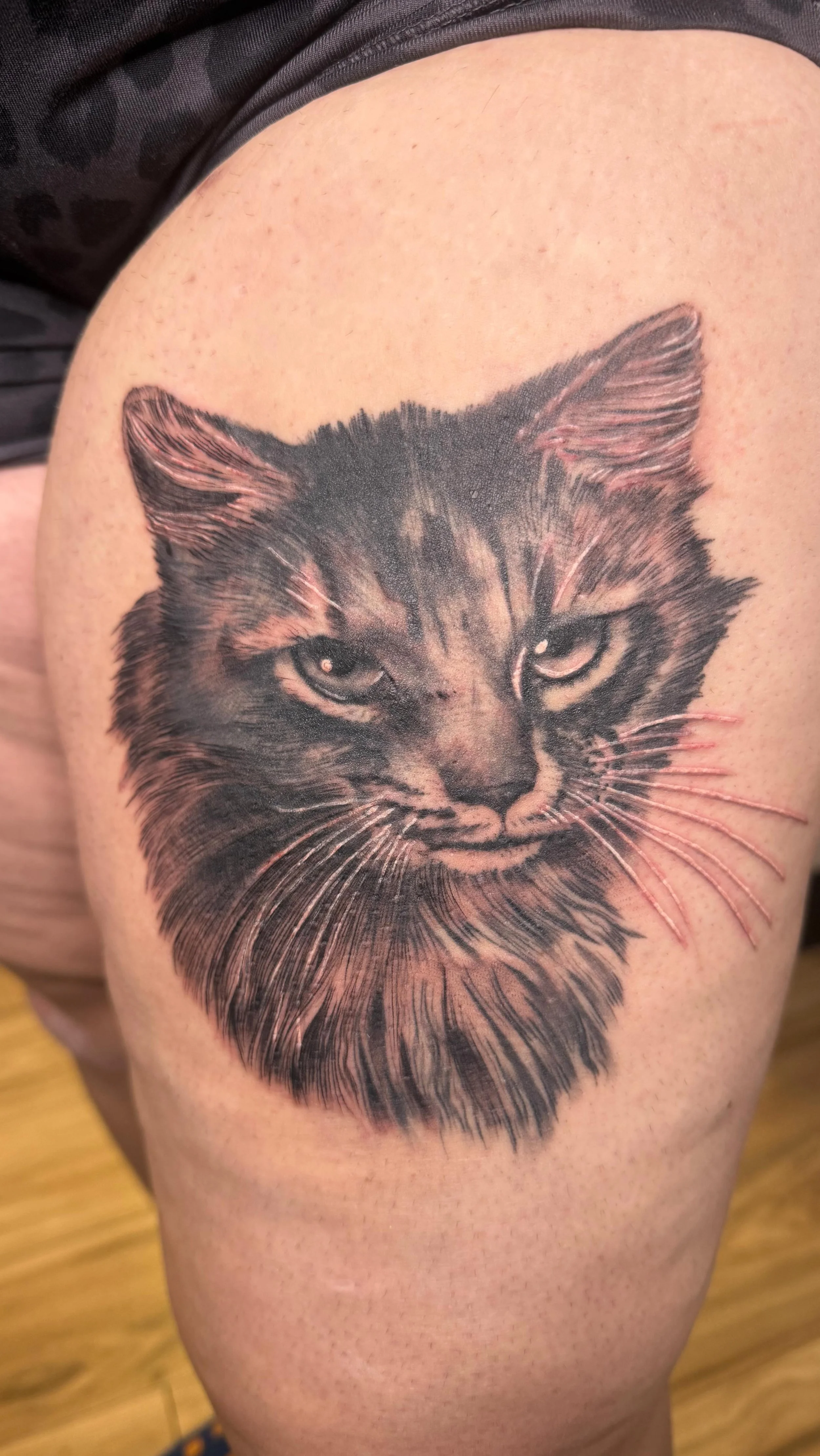 • I had the honor of getting tattooed by Ashley Henson for a 6 hour thigh piece. The overall experience was exceptional and here’s why: 1) The check in process was super simple. I appreciate that it’s done on a computer so you don’t have to fill out paperwork each session if your info hasn’t changed. 2) The shop is super clean. 3) I noticed in Ashley’s booth there was a color chart with different skin tones showing how cool may show up. It affirms that as a black woman, I can have color in my tattoos and it will look great when done by someone skilled. 4) During the session, she checked in frequently and made sure I was good. We took breaks as needed and offered to break up the sessions if the pain was too much. It was bearable, so I sat and got it finished in one session. I was extremely satisfied with everything and I’ll be back for more ink.